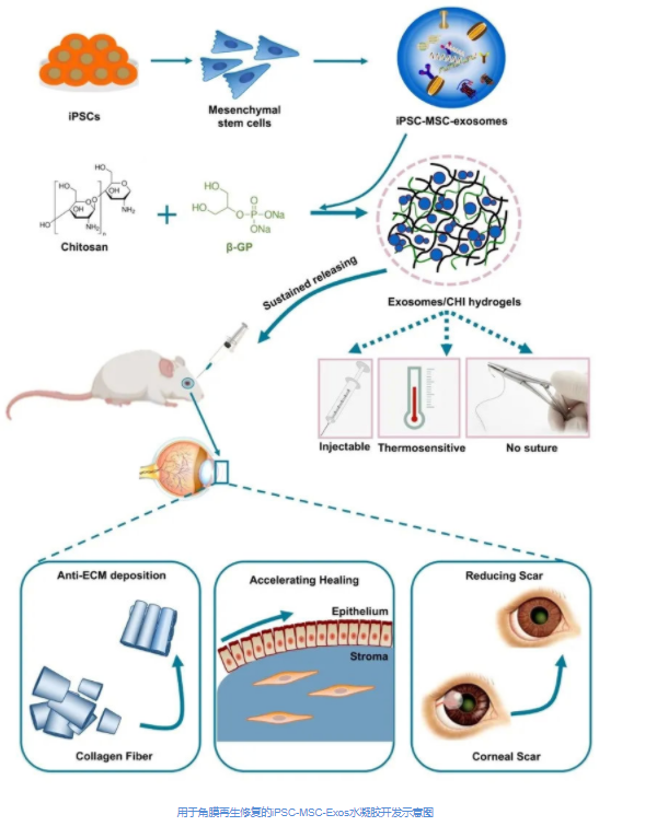 为解决目前所面临的难题,姚克教授团队和周民教授团队决定从角膜疤痕的分子机制入手,并结合新型生物材料的研究进展,开发全新的治疗策略。团队开发了一种基于诱导多能干细胞衍生的间充质干细胞分泌的外泌体(iPSC-MSC-Exos)与温敏壳聚糖/明胶水凝胶相结合的新方法,发现可明显减少大鼠角膜疤痕形成并加速上皮和基质的愈合过程。