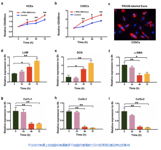 为解决目前所面临的难题,姚克教授团队和周民教授团队决定从角膜疤痕的分子机制入手,并结合新型生物材料的研究进展,开发全新的治疗策略。团队开发了一种基于诱导多能干细胞衍生的间充质干细胞分泌的外泌体(iPSC-MSC-Exos)与温敏壳聚糖/明胶水凝胶相结合的新方法,发现可明显减少大鼠角膜疤痕形成并加速上皮和基质的愈合过程。