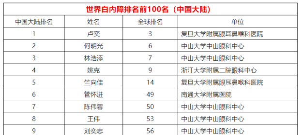中国4位眼科医生入选全球青光眼专家国际排名前50名
