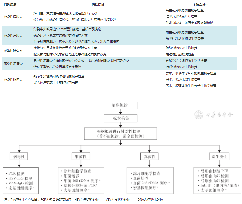 图1 眼部及周围附属器解剖示意图 图2 感染性眼病病原学诊断路径 1. 感染性结膜炎:结膜暴露于外界环境中容易发生感染性结膜炎,结膜充血及分泌物增多是其典型的临床特征,多数结膜炎无需进行微生物检查。但对于流行性、难治性、复发性或常规治疗无效的感染性结膜炎,结膜刮片、培养或核酸检测对其诊疗具有重要意义[9]。感染性结膜炎常见的病原体有金黄色葡萄球菌、肺炎链球菌、流感嗜血杆菌、其他α-溶血性链球菌、肠杆菌目、不动杆菌属、棒状杆菌属、腺病毒(儿童3、7型;成人8、11、19型)、单纯疱疹病毒(1、2型)、柯萨奇病毒A 24型及肠病毒70型等。A~C血清型沙眼衣原体可引起沙眼性结膜炎,D~K血清型沙眼衣原体可引起包涵体性结膜炎[10, 11]。 2. 感染性角膜炎:感染性角膜炎多由病原微生物侵入角膜引起,对拟诊化脓性角膜炎(细菌、真菌、阿米巴感染)者需通过实验室检查进行确诊[12]。而对于非化脓性(病毒性)角膜炎者,可依靠反复发作的病史及角膜病变特点进行临床诊断。由于角膜病灶取材量少,标本应立即进行涂片染色镜检或床旁微生物接种;除常规角膜刮片和培养外,还可选择进行病原体核酸检测。细菌性角膜炎以金黄色葡萄球菌、表皮葡萄球菌、肺炎链球菌、溶血性链球菌、铜绿假单胞菌(隐形眼镜)及肠杆菌目细菌等感染为主[13];非典型分枝杆菌(龟分枝杆菌、偶发分枝杆菌、脓肿分枝杆菌)较为少见,一般见于创伤后或屈光手术后的患者。病毒性角膜炎以单纯疱疹病毒(1、2型)、水痘-带状疱疹病毒、柯萨奇病毒A24、肠道病毒70感染为主,另外埃博拉病毒和虫媒病毒感染(寨卡病毒、登革热和基孔肯雅病毒)可引起轻度角膜炎[14]。真菌性角膜炎常发生于植物外伤或有眼表慢性疾病的患者中,常见的丝状真菌有镰刀菌、曲霉菌、丝孢菌属、拟青霉属、支顶孢属和弯孢菌属等。在免疫功能低下的患者中,可出现念珠菌、隐球菌引起的角膜炎[15]。寄生虫性角膜炎罕见,以棘阿米巴原虫感染为主,另外还有微孢子虫、变形虫及蝇蛆幼虫所致的角结膜炎[16]。 3. 感染性睑缘炎:睑缘出现如下体征之一可疑诊为感染性睑缘炎。(1)睑缘充血、睫毛脱落,睫毛基底部见小脓疱、鳞屑或袖套样物质;(2)对于经验性治疗无效的前部睑缘炎患者可进行睑缘分泌物培养[17](需氧及厌氧培养同时进行);(3)对于睑板腺功能障碍或眼部红斑痤疮患者,睫毛有袖套样改变时,需进行睫毛螨虫显微镜检查,涂片和培养有助于发现病原菌。常见病原体有金黄色葡萄球菌、表皮葡萄球菌、痤疮皮肤杆菌、酵母菌(皮屑芽孢菌)、毛囊蠕形螨(睫毛根部)、蝇蛆幼虫及阴虱等,注意区别正常菌群[18]。 4. 感染性泪道炎:泪液的排出系统称为泪道,出现如下体征可拟诊为泪道感染,如泪溢、内眦部黏性分泌物,泪小点或泪囊处红肿,挤压泪小点或泪囊后可见脓性分泌物溢出。经验性治疗无效的泪小管炎或泪囊炎并发角结膜炎或眶蜂窝织炎患者,需进行泪道分泌物细胞微生物学检查[19]。常见病原体有放线菌科属(放线菌属和诺卡菌属最常见)、肺炎链球菌、溶血性链球菌、流感嗜血杆菌、金黄色葡萄球菌及革兰阴性杆菌等。泪道真菌(曲霉菌、链格孢霉、念珠菌、枝顶孢属)感染较罕见[20]。 5. 感染性眼内炎:特指微生物在眼内引起的感染,进展迅速,属临床急重症致盲性眼病,包括眼内炎(细菌、真菌)、病毒性眼内炎、寄生虫性眼内炎等。感染性眼内炎常合并开放性眼外伤、内眼手术史、糖尿病、器官移植、长期免疫抑制剂使用史。表现为眼红、眼痛、流泪、视力下降,睫状充血、房水闪辉、房水浮游细胞乃至前房积脓、瞳孔后粘连、玻璃体明显混浊、视网膜前绒球样混浊等[21]。外源性眼内炎常见于术后感染和眼外伤(特别是白内障和青光眼术后),常见病原体包括葡萄球菌、肠球菌、链球菌、肠杆菌、非发酵菌、需氧芽孢杆菌、曲霉菌、镰刀菌、暗色真菌等,表现为多病原体混合感染,其中凝固酶阴性葡萄球菌易造成急性感染,痤疮皮肤杆菌是慢性感染最常见原因,警惕高毒力肺炎克雷伯菌的眼内感染,假单胞菌与丝状真菌少见[22]。内源性眼内炎多来自血源性感染,常见病原体有肺炎链球菌、葡萄球菌、α-溶血性链球菌、分枝杆菌、酵母菌、丝状真菌、肠球菌、乏养球菌、颗粒链菌、流感嗜血杆菌、韦荣球菌、普雷沃菌、念珠菌等。视网膜炎以病毒感染为主,包括单纯疱疹病毒、巨细胞病毒、带状疱疹病毒、EB病毒等[23]。虹膜、睫状体和/或脉络膜的炎症可与细菌来源(伯氏疏螺旋体、梅毒螺旋体、分枝杆菌、钩端螺旋体、巴尔通体)、病毒来源(疱疹病毒、巨细胞病毒)或寄生虫来源(弓蛔虫、弓形虫、盘尾丝虫、囊尾蚴)的全身性或局部性感染有关。刚地弓形虫是脉络膜视网膜炎的元凶,是感染性后葡萄膜炎的主要原因[24]。